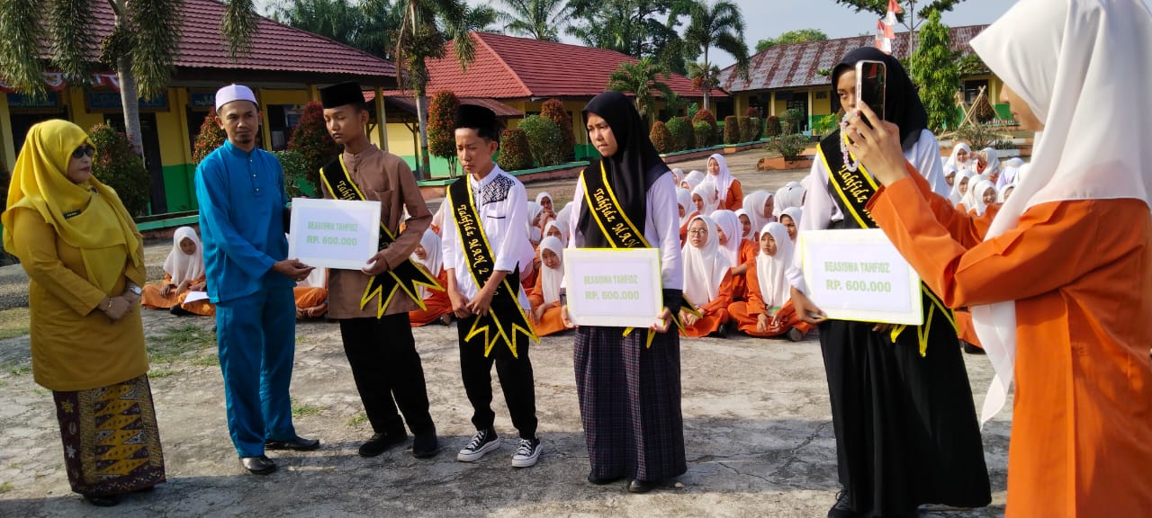 Lebih lanjut Hajah Elya Pitri menambahkan : bahwa kepada lima siswa siswi Tahfizh : Hani Gustiara : 7 Juz, M. Faiz Az Zahran : 5 Juz, Fazura : 5 Juz, Arian Saputra : 4 Juz dan ErikMudana, : 3 JUz. , karena sudah berhasil menyelesaikan tahfizul beberapa Juz Al-Qur’an. masing - masing mereka mendapatkan Uang pembinaa sebesar 600,00,00 rupiah. Semoga dapat menjadi pemacu motivasi bagi siswa yang lainnya agar lebih baik lagi dari yang sekarang. “Bagi siswa yang lain teruslah berusaha untuk menjadi lebih baik lagi untuk kehidupan yang sekarang maupun akan datang,†harapnya.