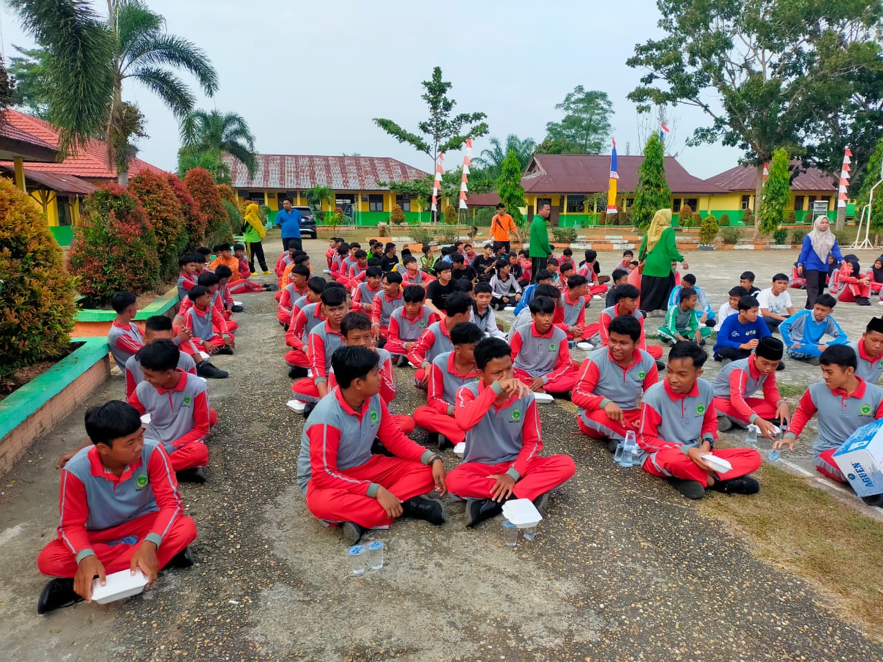 Kegiatan ini merupakan bagian dari program kesehatan yang bertujuan untuk meningkatkan kesadaran akan pentingnya sarapan pagi sebagai fondasi kesehatan yang baik. Para siswa tampak antusias mengikuti kegiatan ini dengan mengenakan pakaian seragam olahraga berwarna merah yang mencolok, menambah semangat pagi itu.