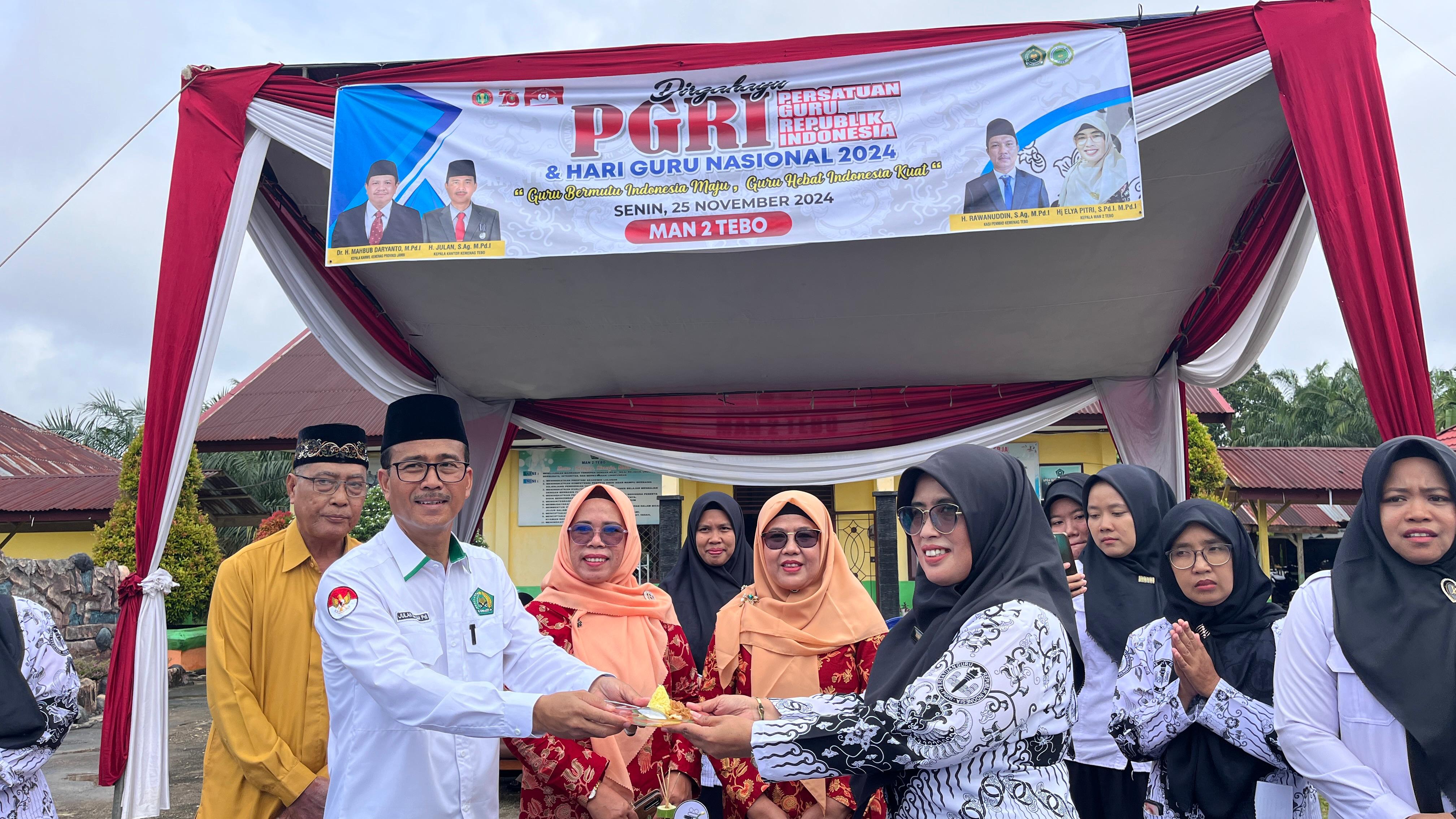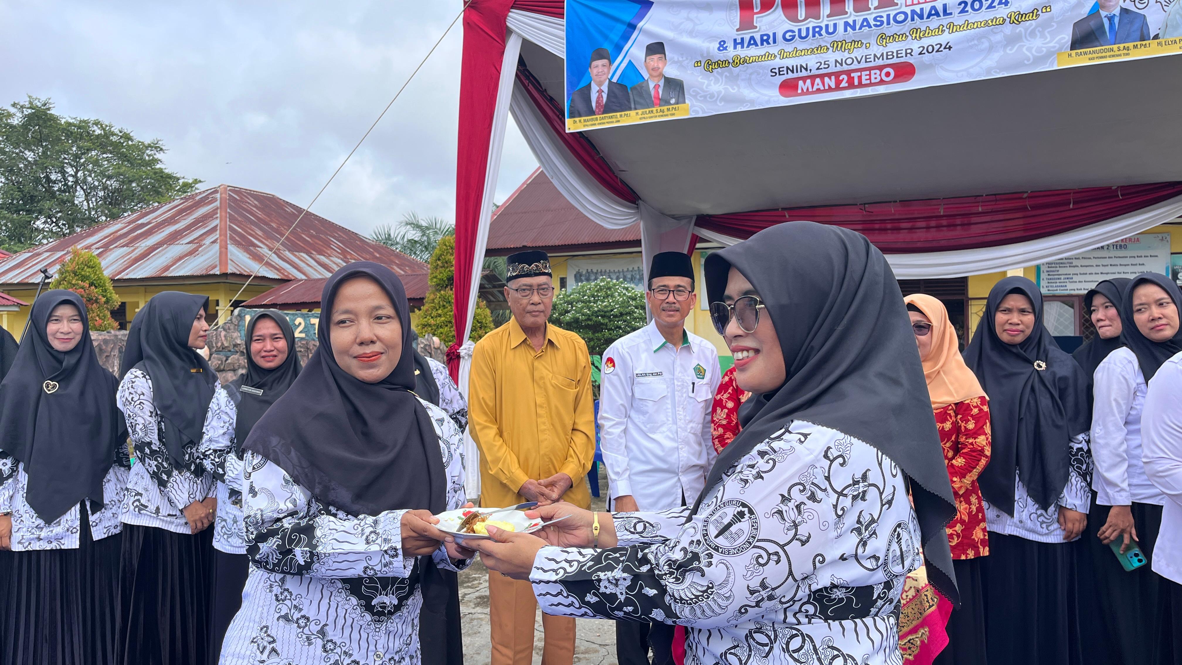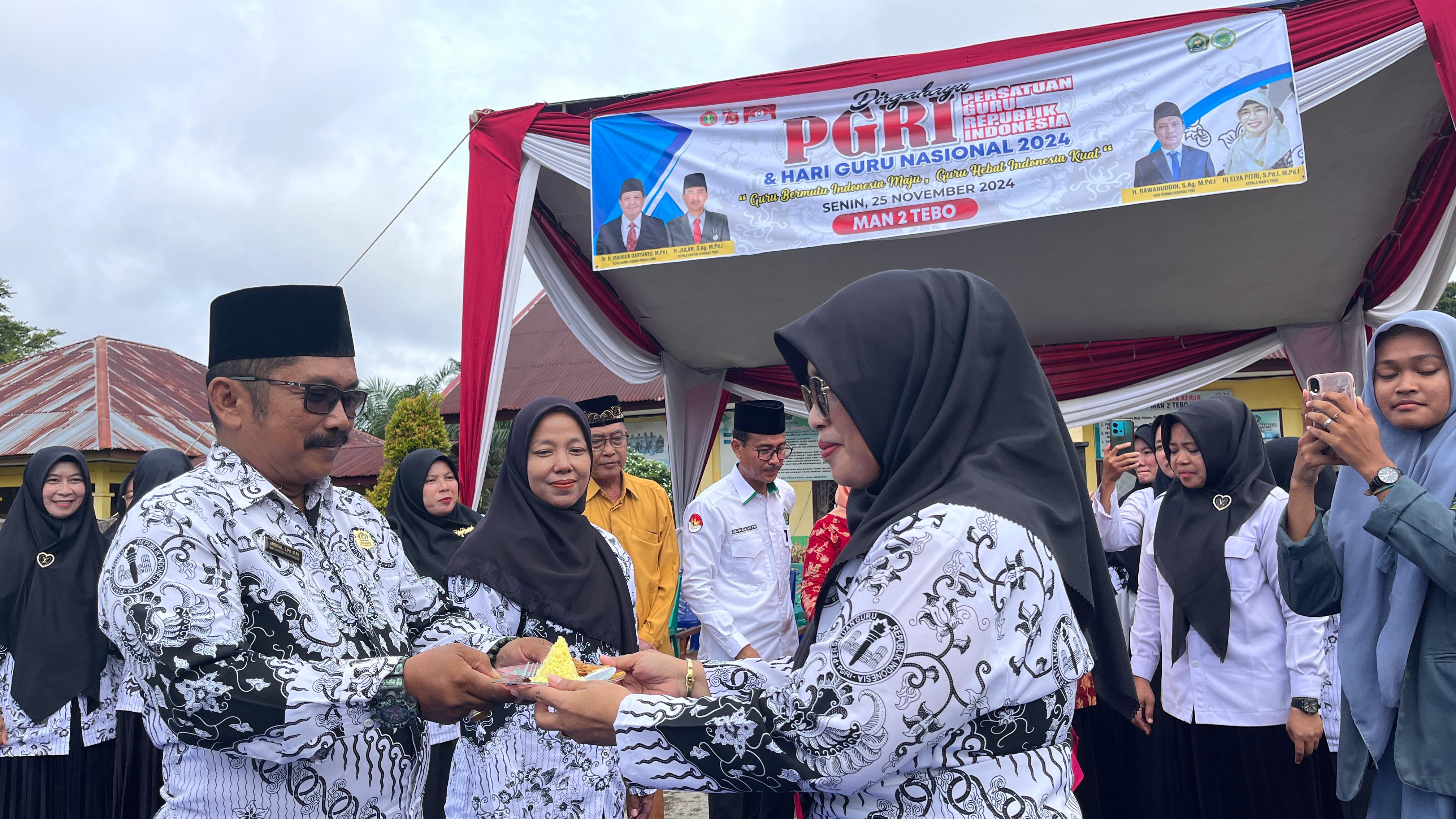 HUMAS MAN 2 Tebo TV, Muara Tebo, News – Dalam rangka mensyukuri dan mempererat tali Silaturrahmi sebagai simbol ungkapan terima kasih Bahagia yang mendalam Keluarga Besar MAN 2 Tebo, Gelar Potong Tumpeng setelah melaksanakan Upacara Memperingari Hari Guru Nasional ke – 30 dan Hari Ulang Tahun PGRI ke – 79 Tahun 2024 Bertempat di Halaman Lapangan Upacara MAN 2 Tebo, Senin, ( 25/11/2024).