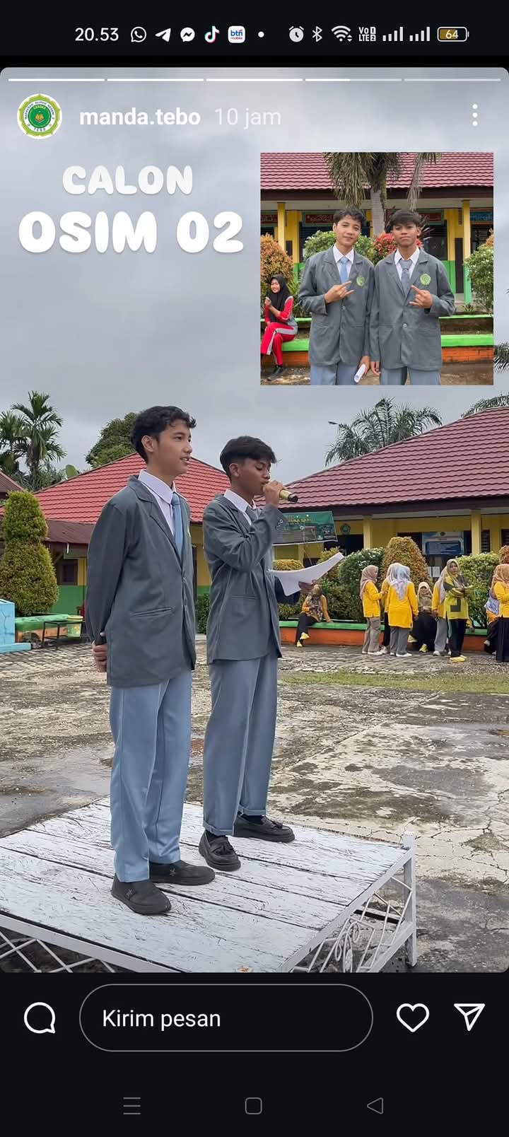 Penyampaian Visi dan Misi kandidat Calon Ketua dan Wakil Ketua OSIM dan MPK yang dilaksanakan pada Sabtu, 23/11/2024 bertempat di Lapangan Upacara MAN 2 Tebo dengan durasi penyampaian perpasangan 10 Menit per paslon.