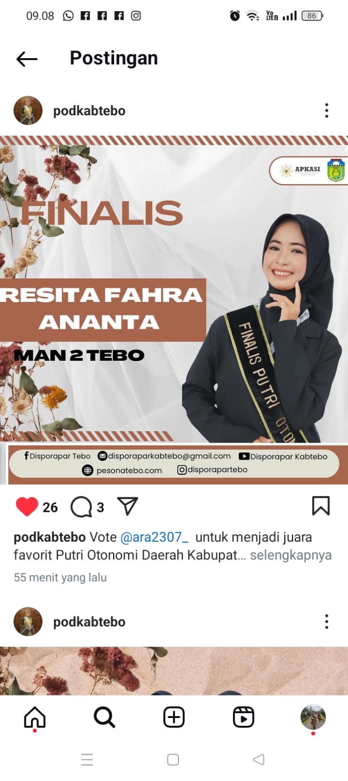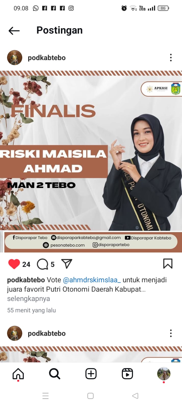 2 Siswi Madrasah Aliyah Negeri (MAN) 2 Tebo, Resita Fahra Ananta Salasabila siswi kelas XI. 1 IPA dan Riski Maisila Ahmad siswi kelas XI. 1 IPA, tahun ini masuk Finalis diajang Pemilihan Putri Otonomi Daerah Kabupaten Tebo Tahun 2024.