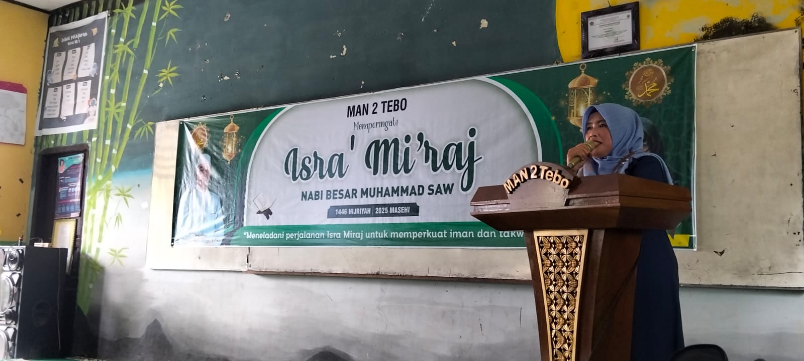 HUMAS MAN 2 Tebo TV, Muara Tebo, News – Madrasah Aliyah Negeri 2 Tebo menggelar peringatan Isra Mi’raj Nabi Muhammad SAW. pada Sabtu, (8/2/2025) di Aula Man 2 Tebo. Tahun ini mengusung thema : “ Meneladani Perjalanan Isra’ Mi’raj untuk memperkuat Iman dan Taqwa “.