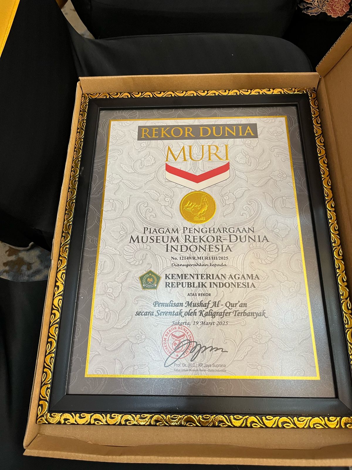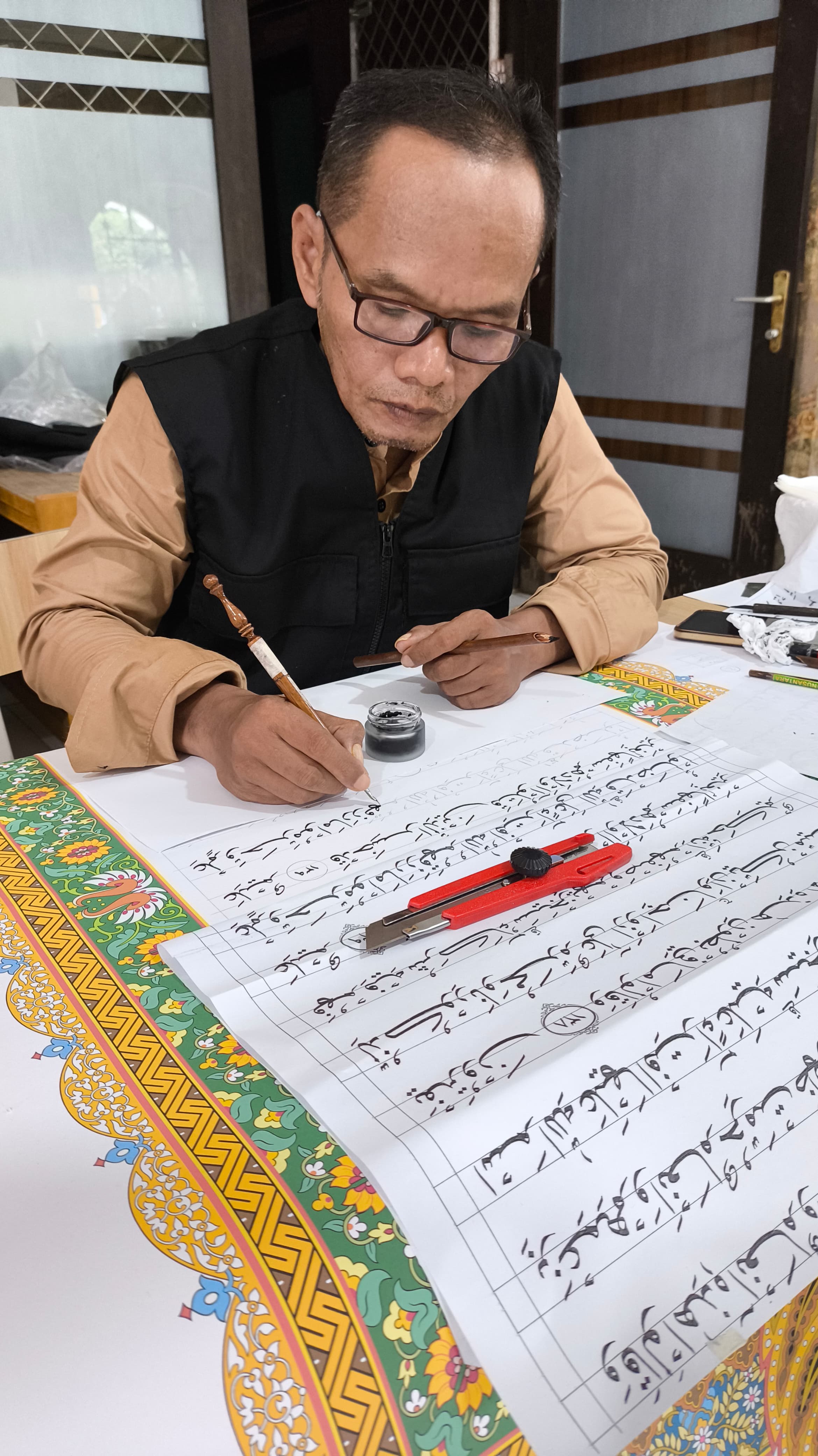 Untuk Propinsi Jambi Lokasi penulisan MUSHAF NUSANTARA di PKP Al Hidayah Propinsi Jambi, Rabu (19/03/2025). dihadiri langsung oleh Kabagkesra Setda Propinsi Jambi Azharuddin dan H. Aries Sepda dari Kantor Wilayah Kementerian Agama propinsi Jambi. Jumlah penulis 25 orang, salah satunya Ustadz Ardianto, S.Pd ( Guru Mata Pelajaran Seni Budaya ; Wakil Kepala Bidang Kurikulum ; Pembina Kaligrafi Islam MAN 2 Tebo dan Dewan Hakim Khat Al-Qur’an Propinsi Jambi.