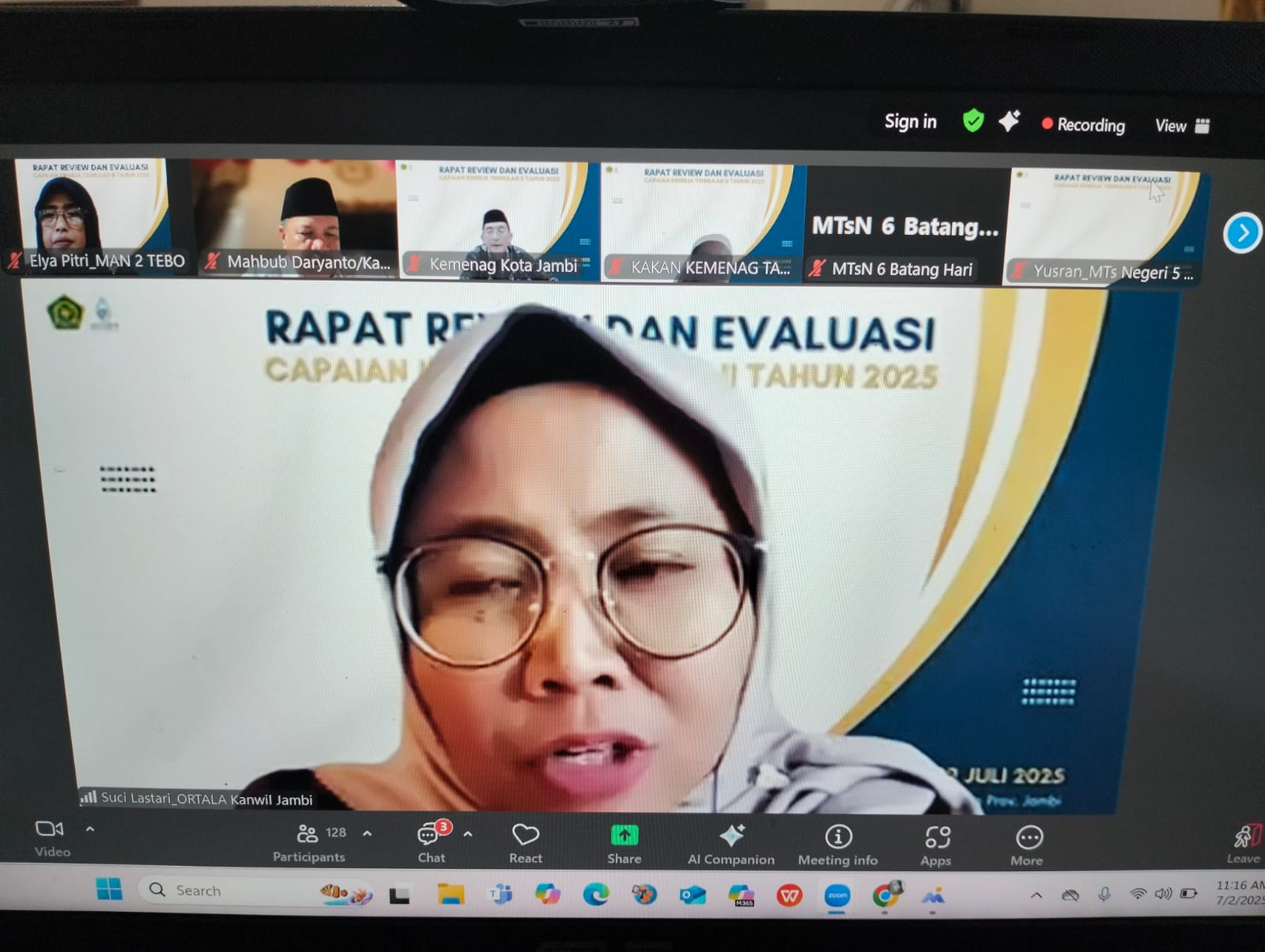 Rapat review dan evaluasi laporan capaian kinerja Triwulan II di ruang zoom meeting Kanwil Kemenag Jambi, dihadiri langsung oleh Kabag TU Abdullah Saman, seluruh Pembimas, seluruh Kepala Bidang dan hadir secara daring melalui zoom meeting seluruh Kakan Kemenag Kabupaten/Kota Se-provinsi Jambi serta seluruh Kepala Madrasah Se-provinsi Jambi,