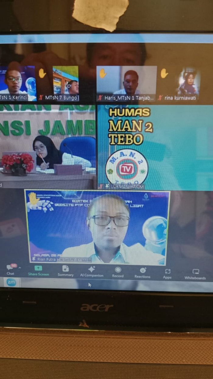 Bimbingan Teknis Website Madrasah dilaksanakan oleh Penmad Kanwil Kemenag Provinsi Jambi dilakukan secara daring melalui aplikasi Zoom Meeting. Acara dibuka langsung oleh Kepala Kantor Wilayah Kementerian Agama Provinsi Jambi, Bapak Dr. H. Mahbub Daryanto, M. Pd. I, didampingi oleh Kabid Penmad, Bapak Dr. H. Dedi Irama Silalahi, S. Sos., M.A.B. dalam sambutannya menekankan pentingnya penguatan kompetensi digital di lingkungan Madrasah.