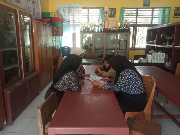 Bertempat di ruang guru kegiatan ini bertujuan untuk membimbing para peserta dalam membahas Soal dan menganalisanya Herlina, S.Pd, M.Pd guru Geografi bersemangat membimbing ketiga siswanya begitu juga dengan ibu Sri Rezeki guru Matematika