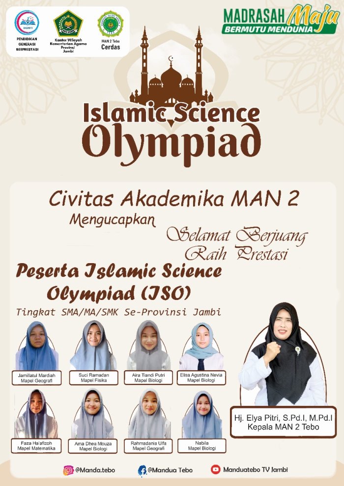 Siswa-siswi MAN 2 Tebo menunjukkan semangat belajar dan berprestasi dengan mengikuti ajang kompetisi Islamic Science Olympiad (ISO) Jambi 2025. Kompetisi bergengsi ini dilaksanakan pada Jumat, 29 Agustus 2025, sebagai salah satu upaya meningkatkan prestasi akademik siswa di tingkat regional.