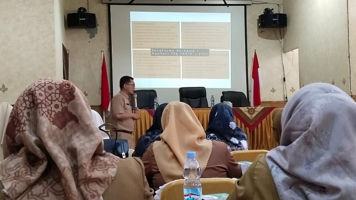 Kegiatan ini menghadirkan Herwan, M.Km, Kasi Promosi dan Pemberdayaan Masyarakat Provinsi Jambi, sebagai narasumber utama. Dalam pemaparannya, Herwan menjelaskan kebijakan kesehatan terkait Usaha Kesehatan Sekolah/Madrasah (UKS/M) sesuai dengan Undang-Undang Nomor 17 Tahun 2023. Ia menekankan bahwa pengembangan sekolah sehat bertujuan menciptakan lingkungan belajar yang mendukung kesehatan fisik, mental, dan sosial siswa.