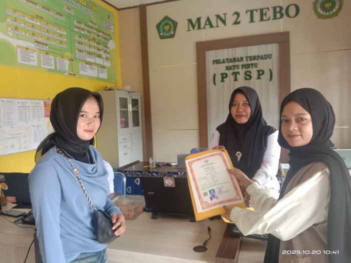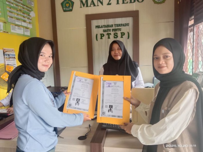 Proses pengambilan ijazah siswa lulusan tahun pelajaran 2024/2024 MAN 2 Tebo dilayani langsung oleh staf TU MAN 2 Tebo. Siswa-siswi yang mengambil ijazah tamatan Madrasah MAN 2 Tebo yang melanjutkan kejenjang yang lebih tinggi atau melamar pekerjaan tampak menunggu giliran untuk mengambil ijazah. Senin (20/10/25).