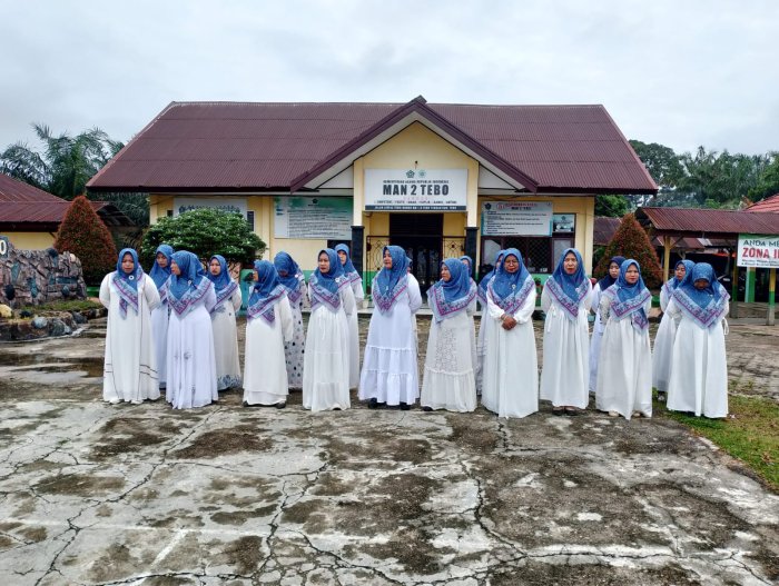 Udara sejuk khas Tebo berpadu dengan suasana religius yang kental. Para siswa laki-laki tampak mengenakan busana putih lengkap dengan sarung dan peci, sementara para siswi terlihat anggun dengan gamis putih dan kerudung senada. Tak hanya siswa, seluruh guru dan tenaga kependidikan juga mengenakan pakaian bernuansa santri, menciptakan nuansa layaknya di lingkungan pesantren.