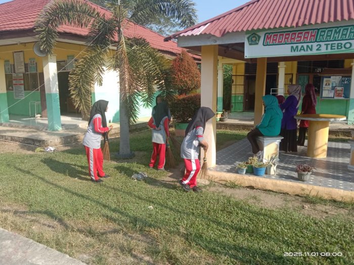 Hal ini dimaksudkan agar seluruh warga madrasah terlibat aktif dalam meningkatkan kebersihan lingkungan madrasah.Para guru dan siswa bertugas di masing-masing bagian yang telah ditentukan sebelumnya. Seluruh siswa mengikuti kegiatan dengan bersemangat dan berharap melalui gerakan ini, MAN 2 Tebo dapat menjadi lebih indah, sejuk, lestari dan hijau. Sekaligus mengajak seluruh siswa dan guru untuk selalu memperhatikan kebersihan dan kenyamanan lingkungan madrasah.