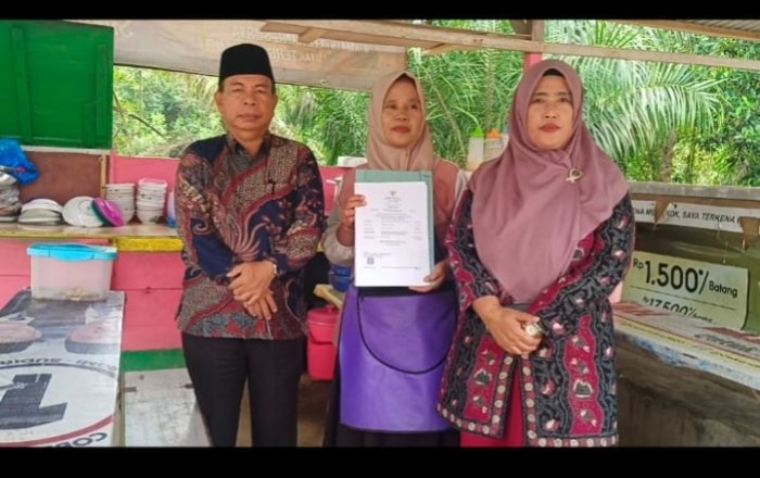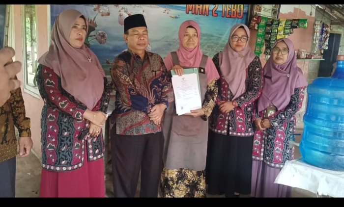 Tebo-MAN 2 Tebo, Kepala Kantor Urusan Agama (KUA) Tebo Tengah, Muhammad Alfadl, S.Ag., bersama Kepala MAN 2 Tebo, Hj Elya Pitri, serta para Pendamping Produk Halal (PPH) dan Penyuluh Agama Islam KUA Tebo Tengah, menyerahkan sertifikat halal kepada empat pemilik kantin di MAN 2 Tebo pada Kamis, 6 November 2025.