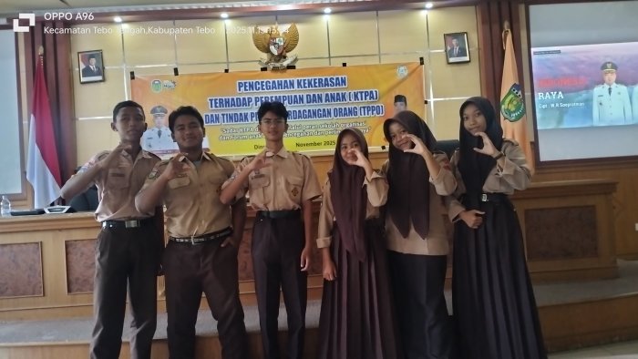 Enam siswa MAN 2 Tebo yang merupakan pengurus Forum Anak Daerah (FAD) Kabupaten Tebo mengikuti kegiatan sosialisasi pencegahan kekerasan terhadap perempuan dan anak serta tindak pidana perdagangan orang (TPPO). Kegiatan ini diselenggarakan oleh Dinas Sosial P3A Kabupaten Tebo dan berlangsung di Aula Melati, Kantor Bupati Tebo, pada Kamis, 13 November 2025.