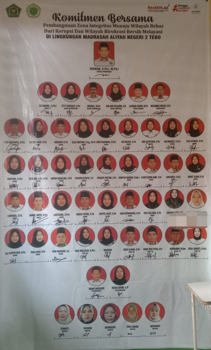 HUMAS M A N 2 Tebo TV, Muara Tebo, News - 07 Februari 2026 - Dalam upaya memperkuat tata kelola lembaga yang bersih, transparan, dan akuntabel, MAN 2 Tebo menyelenggarakan kegiatan Penandatanganan Pakta Integritas dan Komitmen Bersama Pembangunan Zona Integritas (ZI) menuju Wilayah Bebas dari Korupsi (WBK) serta Wilayah Birokrasi Bersih dan Melayani (WBBM) untuk tahun 2026.
